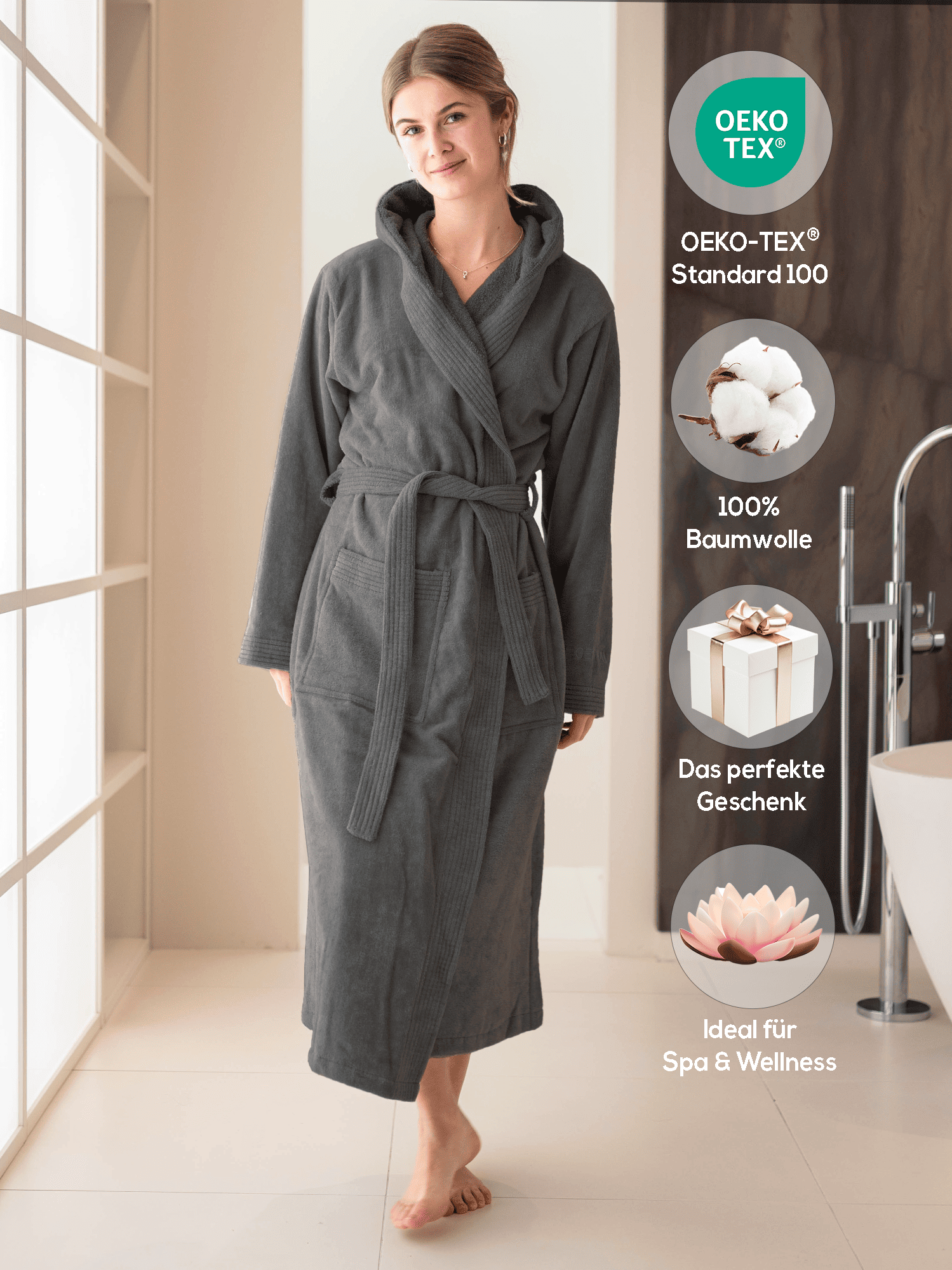 Tauchen Sie ein in pure Entspannung mit dem Siegenthal® Damen Bademantel – Ihr Begleiter für genussvolle Momente, sei es nach einem erholenden Saunagang oder während einem wohltuenden Spa Aufenthalts. Unser exklusiver Bademantel, sorgsam aus 100% hochwertiger Baumwolle gefertigt, verbindet luxuriösen Komfort mit elegantem Design. Die flauschige Frottee-Innenseite umhüllt Sie in pure Gemütlichkeit, während die edle Velour-Außenseite eine stilvolle Note verleiht. Die großzügige Kapuze schenkt Ihnen ein Gefühl von Geborgenheit. Gönnen Sie sich das Beste für Ihren Rückzugsort und umhüllen Sie sich in puren Luxus – mit dem Siegenthal® Damen Bademantel. Kuscheln Sie sich ein und lassen Sie sich von flauschigem Frottee und sanftem Velour verwöhnen, erleben Sie Entspannung in jeder Faser.